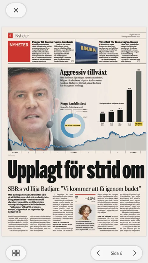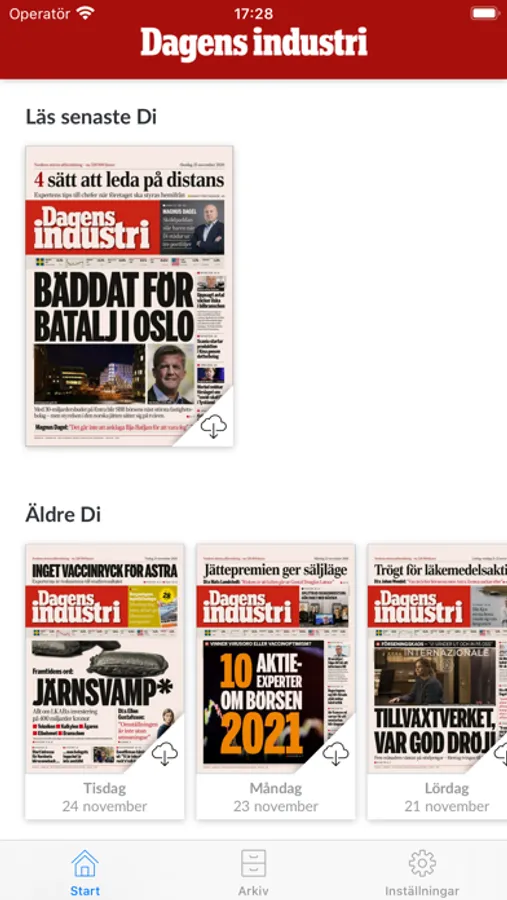 Välkommen till Dagens industri, Di, Nordens största affärstidning. Som prenumerant får du tillgång till tidningen och våra magasin digitalt även i din mobil och läsplatta. Morgondagens tidning publiceras online varje kväll klockan 21. Du får hela tidningens innehåll i en tydlig presentation och med lättläst artikelläge samt vårt magasin Di Weekend.