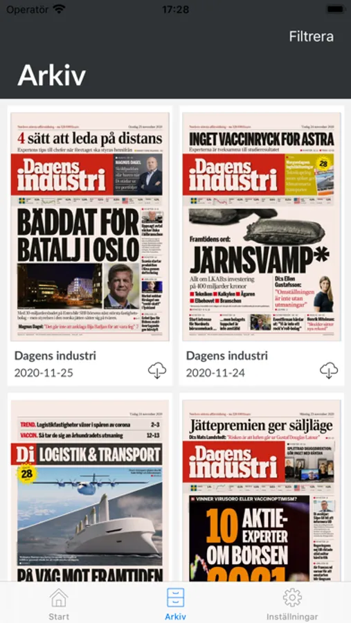 I vår app Di e-tidning kan du välja att läsa en digital version av tidningen Dagens industri, Di, som tidningssidor eller i ett artikelläge. Du kan även välja att få tidningen nedladdad automatiskt samt ställa in hur många dagar en nedladdad tidning skall finnas kvar på din enhet.