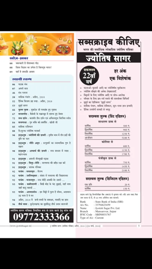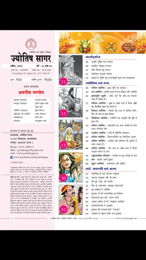 Jyotish Sagar is the most popular astrological monthly magazine in Hindi language. It is being published from March, 1997. This magazine covers most of branches of astrology like as : Classical Hindu Astrology, Modern Astrology, Krishnamurthi or KP Astrology, Jaimini Astrology, Career Astrology, Marriage Astrology, Medical Astrology, Remedial Astrology, Lal Kitab, Tajik or Annual Horoscopy, Palmistry, Numerology, Body Reading and Samudrik Shastra, Mundane Astrology, Electional or Muhurta Astrology, Vedic Astrology, Astrological Mathematics and Siddhant Jyotish or Hindu Astronomy etc. Detailed Panchanga (calendar), Monthly Ephemeris and Various type of Muhurta are also published in every issue. Monthly Horoscope (Rashiphal) and Tansitary Forecast are also attractive feature of Jyotish Sagar. Many permanent collums like as festival planner of the month, Ramcharitmans, Upanishad, Gita, Ravan Samhita, Puran Purush, Kabir Vaani, Chanakyodesh etc are other attractions of this magazine. Some articles are also published on Vastu, Tantra, Mantra, and Yantra. Every year two Special issues on Deepavali are also published. More than four special issues are published per year.