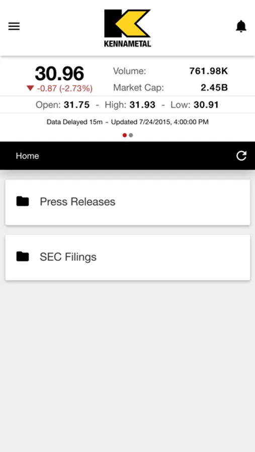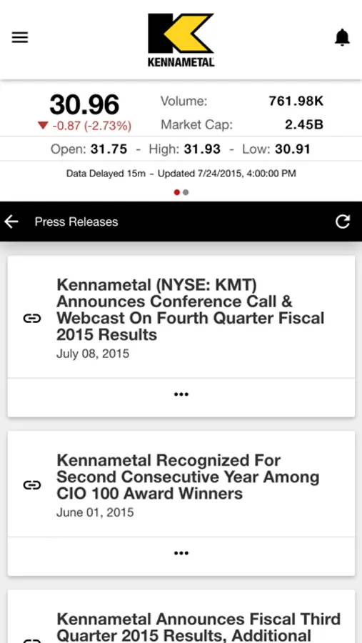 This app gives Kennametal Inc. (NYSE: KMT) investors mobile access to the latest stock data, news, SEC Filings from Kennametal Inc., as well as proprietary company content including presentations, conference calls, videos, sales and marketing collateral, fact sheets, annual reports and other qualitative company information. Investors are able to receive push notifications when new content is added to theIRapp; add events to their calendars, share content as well as download it for offline viewing.