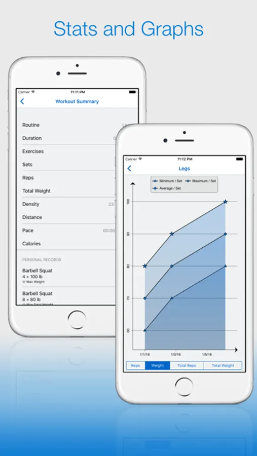 • Graphs plot your progress visually by charting your max, min, and average reps and weights per set and your total reps and weight across all sets