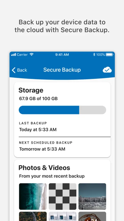 • Secure Backup — Securely back up and restore your content with your allotted amount of storage.