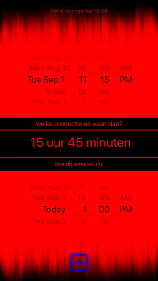 De uitkomst verschijnt onderaan. In het "welke productie en in welke zaal is het?" vakje kun je aan geven in welke zaal en bij welke productie je hebt gewerkt . Dit alles kun je dan (naar je zelf) emailen . door te drukken op "Doe dit emailen nu."