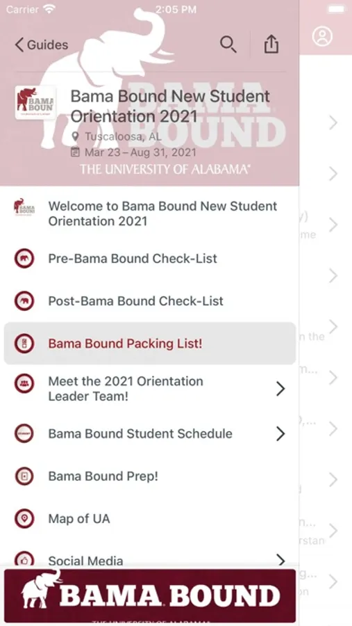 Bama Bound is an all-in-one app for your phone or tablet that allows users to access information on events such as Bama Bound New Student Orientation, University Days, and Sweet Home Capstone just to name a few.