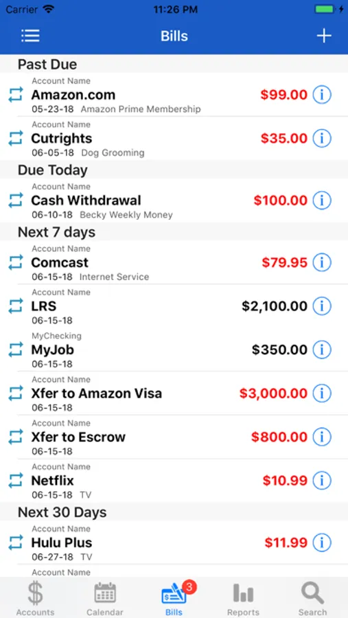- Bills that offer flexible scheduling and reminding of due bills all based on your preference.