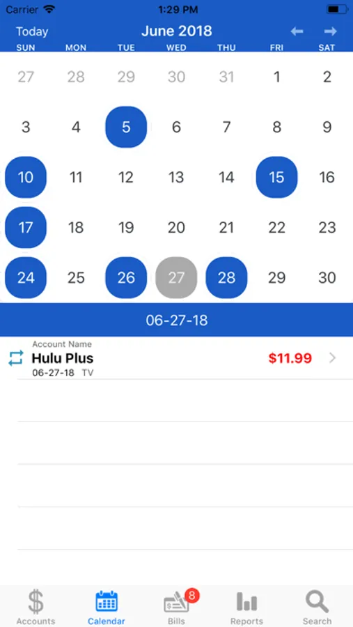- Calendar that has days circled when bills are due and the ability to record those bills from the calendar display