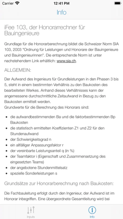 Grundlage für die Honorarberechnung bildet die Schweizer Norm SIA 103, 2003 „Ordnung für Leistungen und Honorare der Bauingenieure und Bauingenieurinnen“. Die entsprechende Norm ist erhältlich unter www.sia.ch.