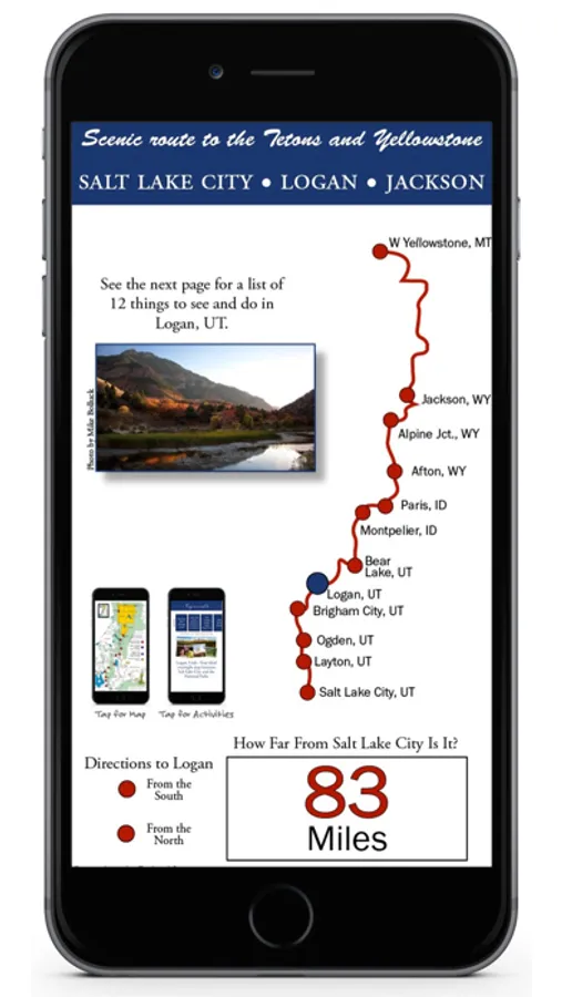 Using this app will allow the visitor to easily navigate and view the cities along the way. By simply tapping the cities from the map, one can see not only how far it is from Salt Lake City, but also read a few interesting side notes and things to see and do along the way. Rotate your tablet vertically and interactive map will show you other scenic side routes along the way as well!