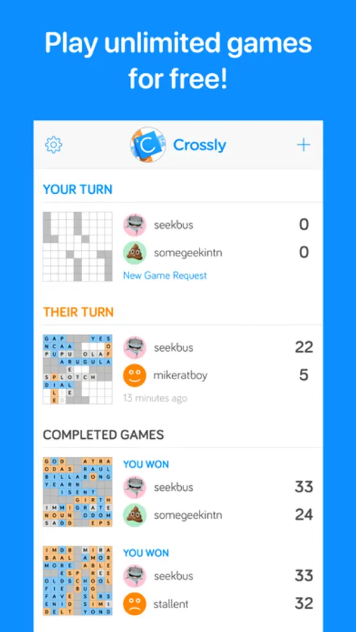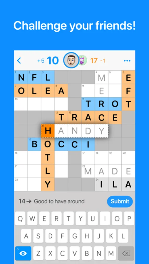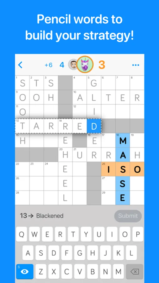 Challenge your friends in the fun strategic word game that combines classic crosswords with the spirit of friendly competition! In Crossly™, two players take turns filling out the board, accumulating points for each correct clue by gaining a point for each letter in the clue and subtracting a point from their opponent for any of their intersecting answers. Clean design, fluid animations and playful messaging work together to make this the best crosswords experience in the App Store.