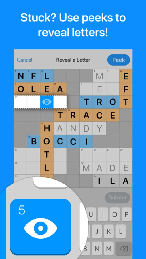 - Peeks: For hard-to-guess clues, you may use one Peek per turn to reveal a letter of your choice. That letter is only visible to the player who initiates the Peek. Bonus Peeks are awarded for completing games and Peek Packs may be acquired via In-App Purchase.