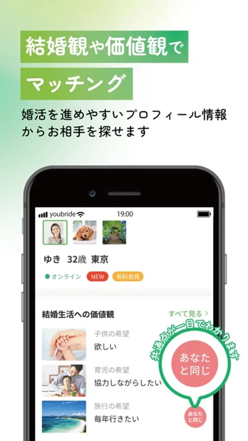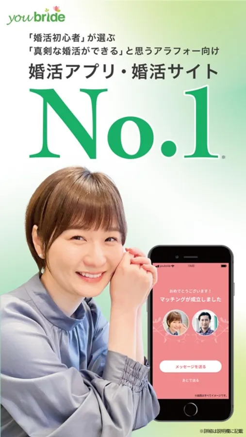 youbride(ユーブライド)は結婚を前提とした恋愛をしたい、将来につながる恋人が欲しいと願う男女が集まる婚活マッチングアプリです。写真/年齢/お住まい/学歴/出身地/年収/休日/職業/趣味/結婚歴(初婚、再婚)/子供の希望などの条件で、全国の会員の中から、あなたにマッチした異性を探すことができます。 合コンや街コン、コンパなどでは見つからないお相手との出会いがあるかも。結婚相手、人生のパートナー、恋人を選ぶ新たな出会いの手段として、ぜひご利用ください!