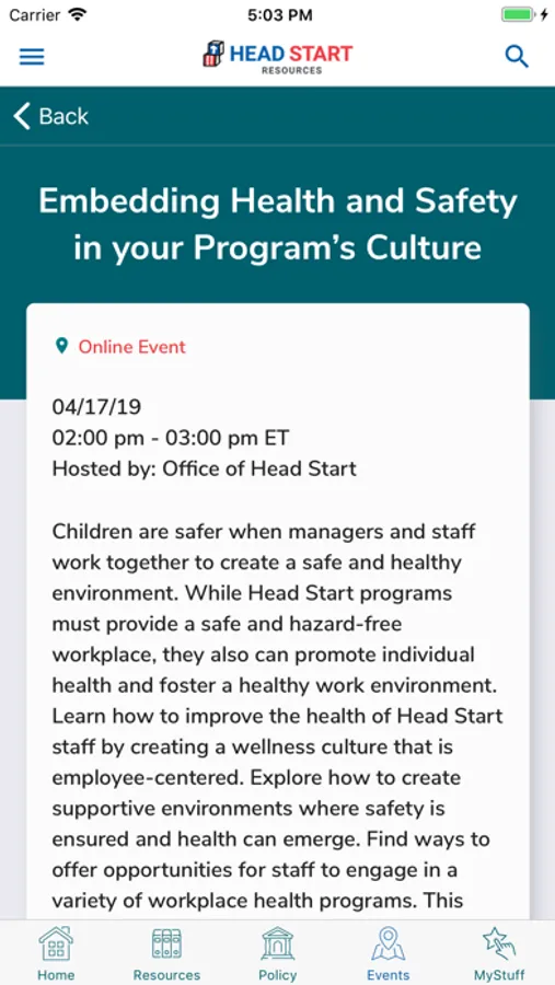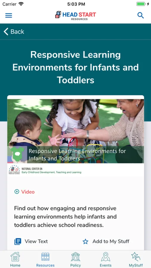 The Head Start Resources app has a brand-new look with great new features and useful content! It provides mobile access to the Early Childhood Learning and Knowledge Center (ECLKC) anytime, anywhere. Our simple and easy-to-use interface lets you browse collections by topic and so much more. Quick access to featured resources, policy, news, and events ensures you're getting the most up to date information from the Office of Head Start (OHS) all in one place.