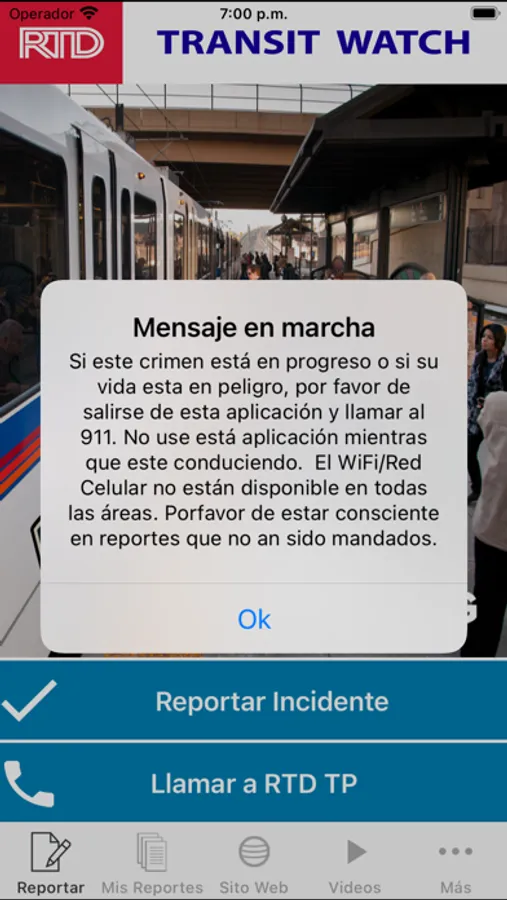 The RTD Transit Watch app is instrumental in providing our customers with multiple means of communication with RTD for quality of ride issues, comments or compliments about our transportation system with a convenient direct call button and a simple to use form to submit electronically. We are dedicated to their comfort and an enjoyable travel experience. Our customer service phone and app lines are monitored 24/7 and we pride ourselves on our speedy response to our customers' needs.The RTD Transit Watch app is designed for use throughout the RTD system, including underground stations. In areas without cellular or Wi-Fi service, the app will store information that is sent by the user and will resend it when cellular or Wi-Fi connectivity returns. The RTD Transit Watch app contains awareness training information.