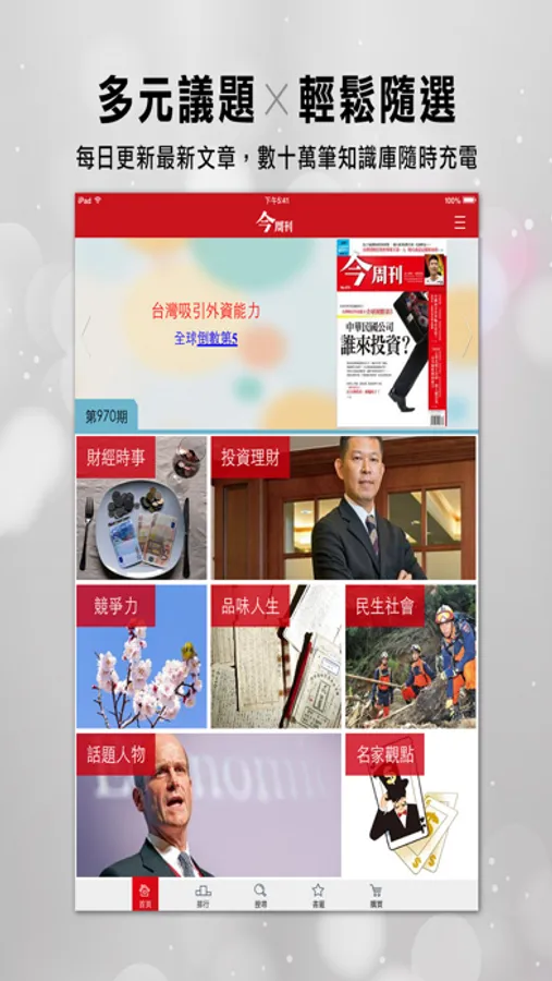 今周隨身讀月付180元閱讀無侷限!透過手機或平板輕鬆掌握今周刊每期新刊和近五十萬篇知識庫,隨時掌握天下事!文章依照屬性分為7個頻道分類:財經時事、投資理財、競爭力、品味人生、民生社會、話題人物與名家觀點,清新的畫面與簡潔的操作功能,讓您隨時隨地都能輕鬆享受便利的行動閱讀。