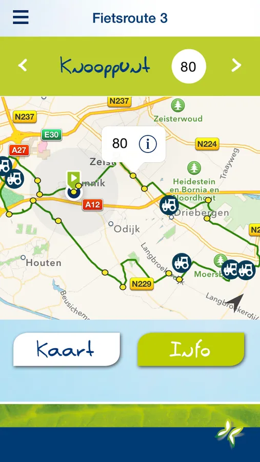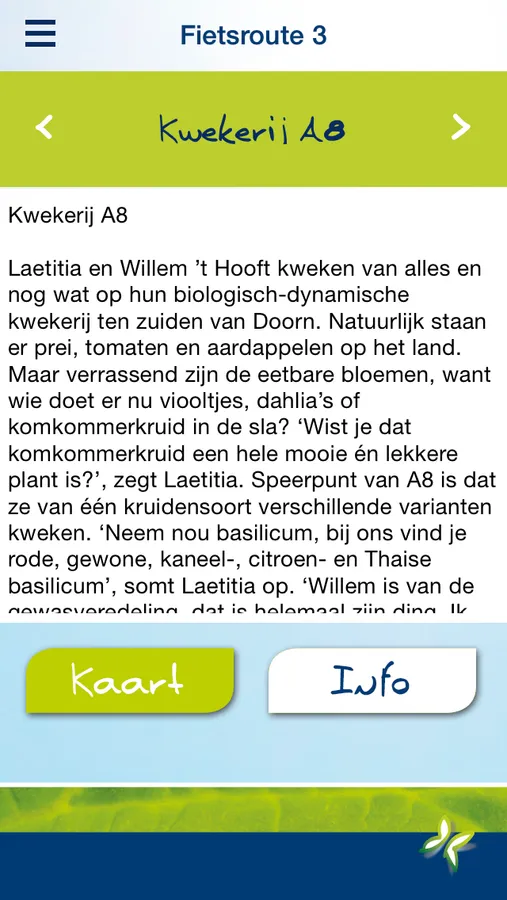 De Bio+ app bevat 12 fiets routes; in elke provincie 1. Je komt langs verschillende mooie plekjes én langs biologische boeren. Aan het einde van elke route, kun je je eigen bio kennis testen met de quiz.