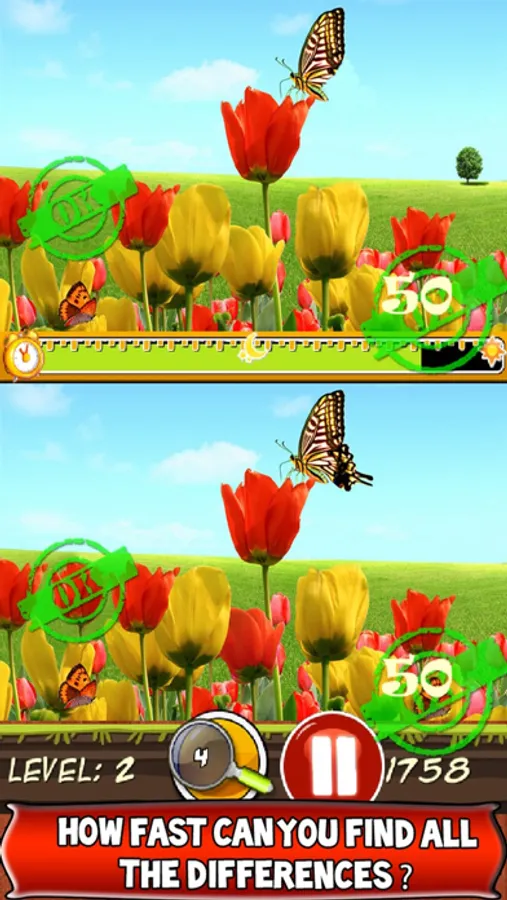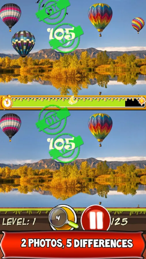 - Find the differences between the two photos before the time runs out, touching the wrong point will decrease your remaining time