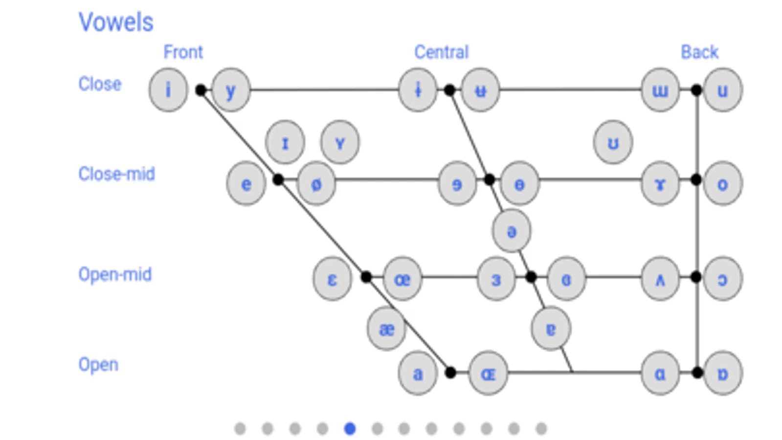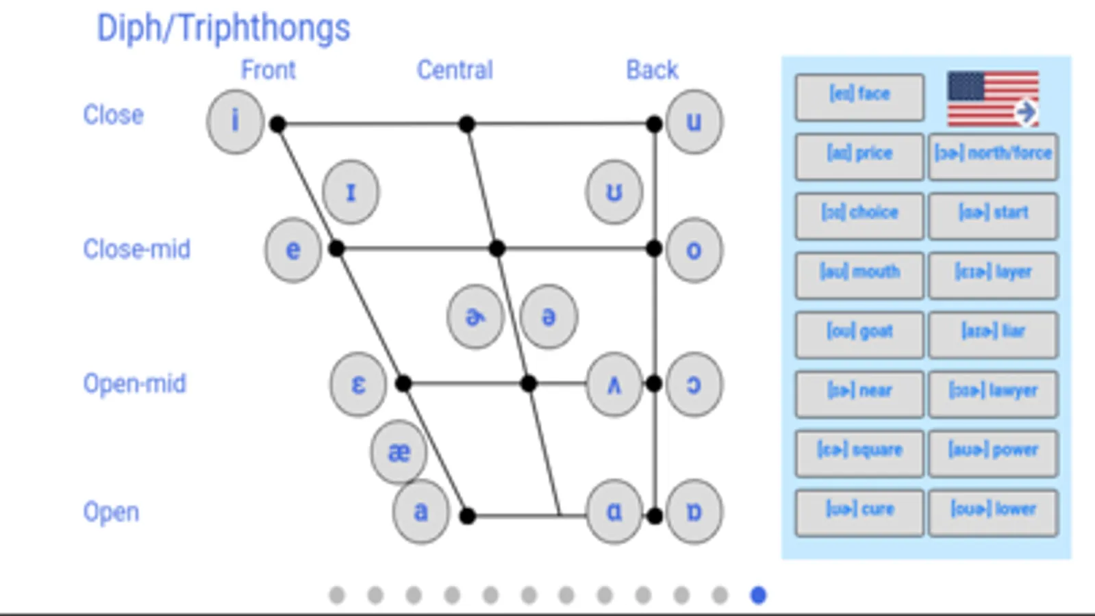 In addition to the official IPA charts, this app presents one extra chart of Meier’s own devising: diphthongs and triphthongs of American and British English. The app is designed by Scott Means, based upon the official charts of the International Phonetics Association and an original interactive design by Eric Armstrong.