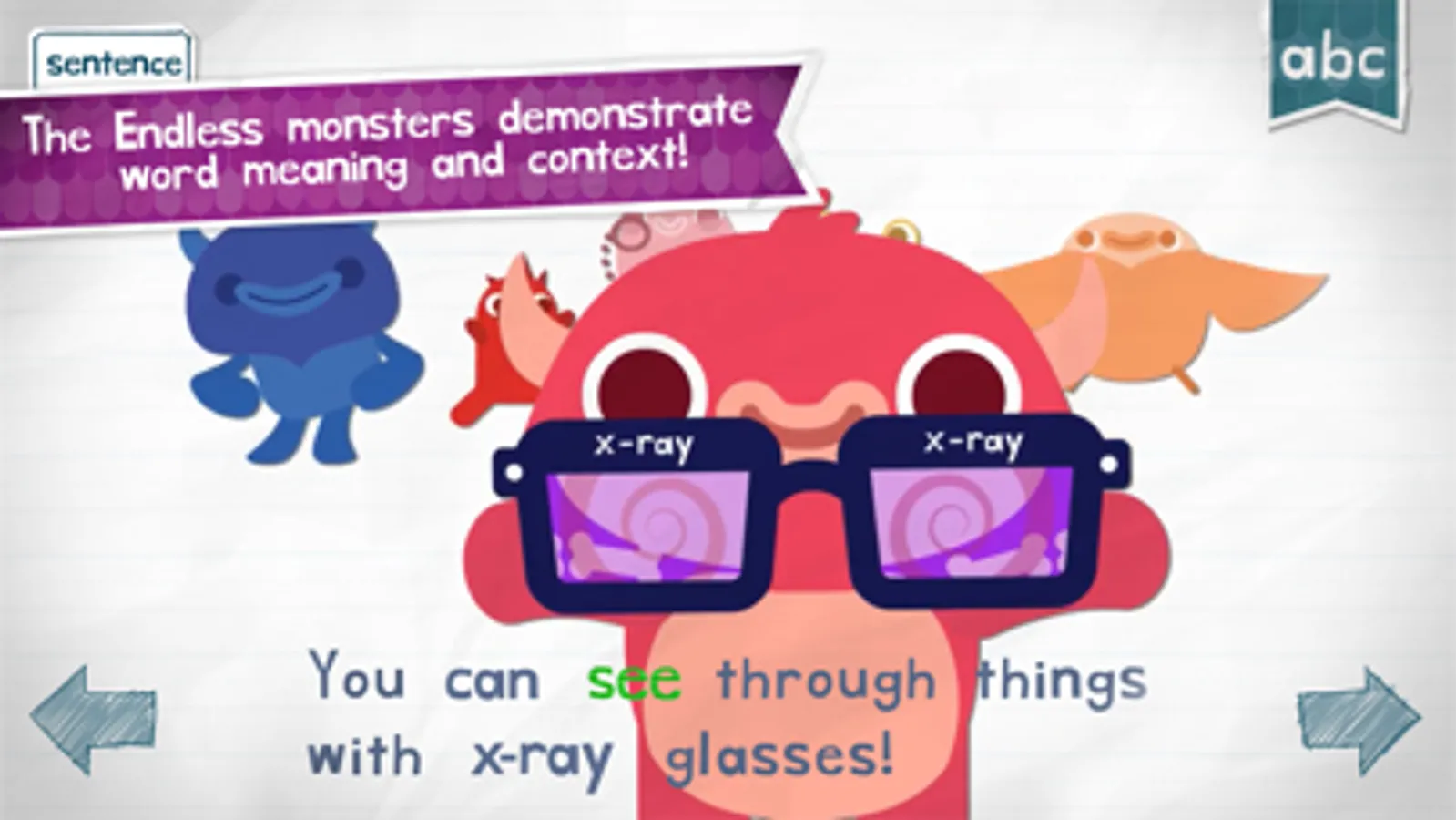 Kids will have a blast learning sight words and their context and usage with the adorable Endless monsters. Each word features an interactive word puzzle with letters that come alive, and then a sentence puzzle with words that become what they describe. See the word "dog" as a barking dog, and the word "up" reach for the sky!