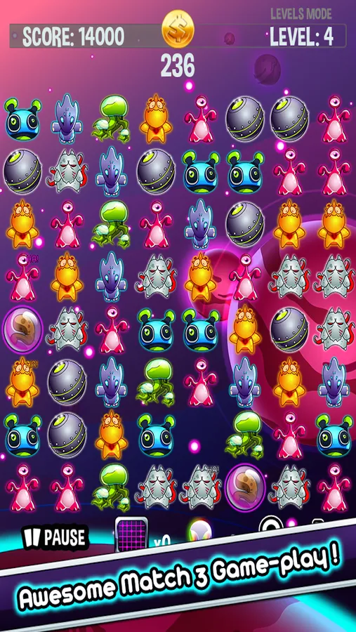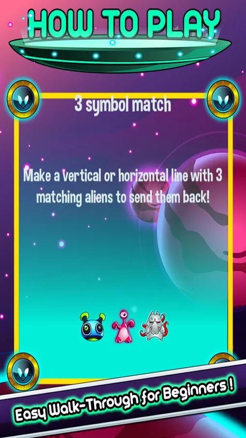 The game is simple. Line up three or more identical aliens vertically or horizontally. Earn tons of tokens along the way and use them to buy fun Power-ups.