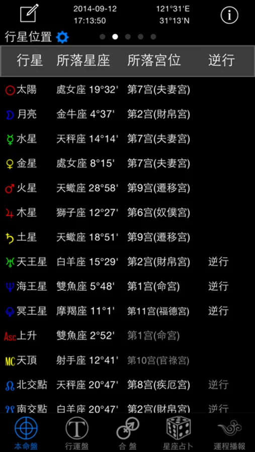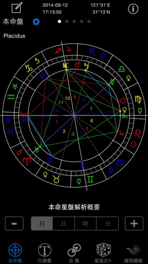 星座大师展现经典的Astrolog32星盘图,帮助您免费查看个人本命星盘。
