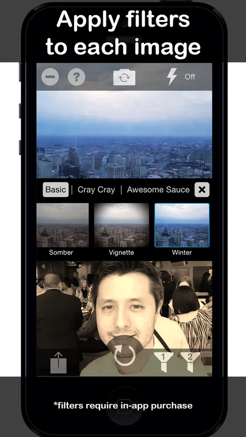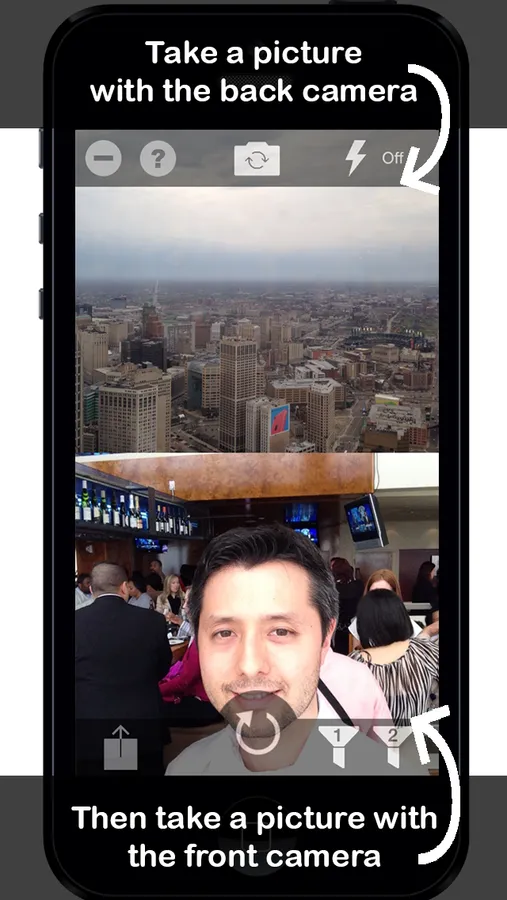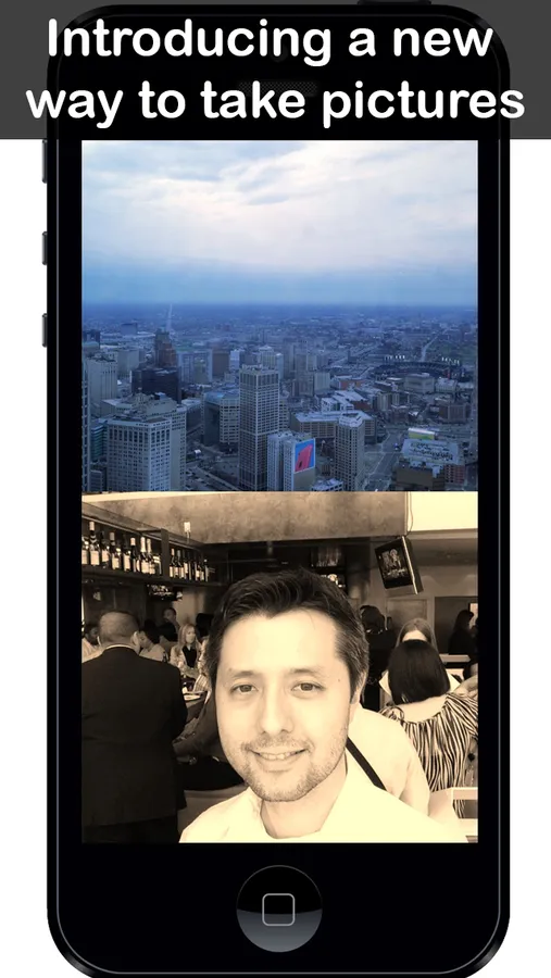 Introducing a new way to take pictures. Take one picture with the back camera, take another picture with the front camera, and share or save them as a single image. Now you can show where you’ve been, and be part of the photo yourself. Get creative and create optical illusions or hilarious images.