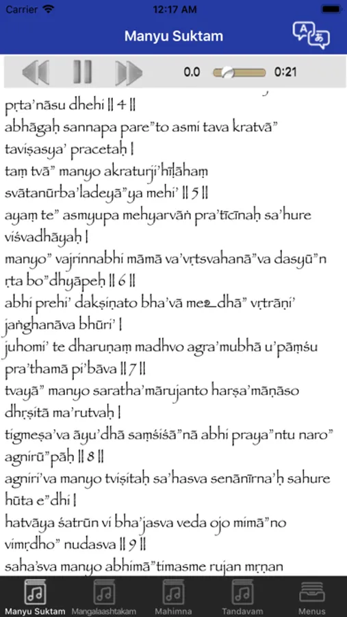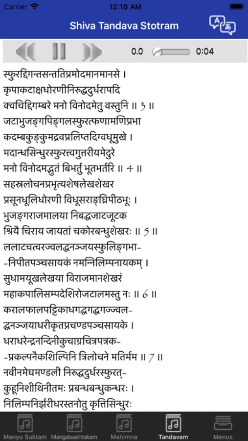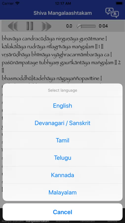 * Lyrics available in English,Thamil ,Sanskrit,Telugu,kannada & Malayalam (User can select different languages for lyrics using world icon in the top left corner).