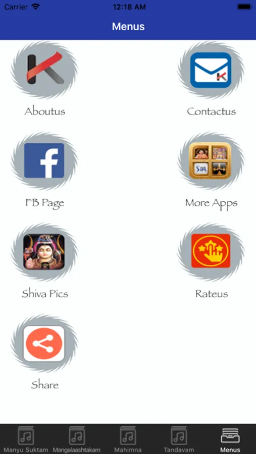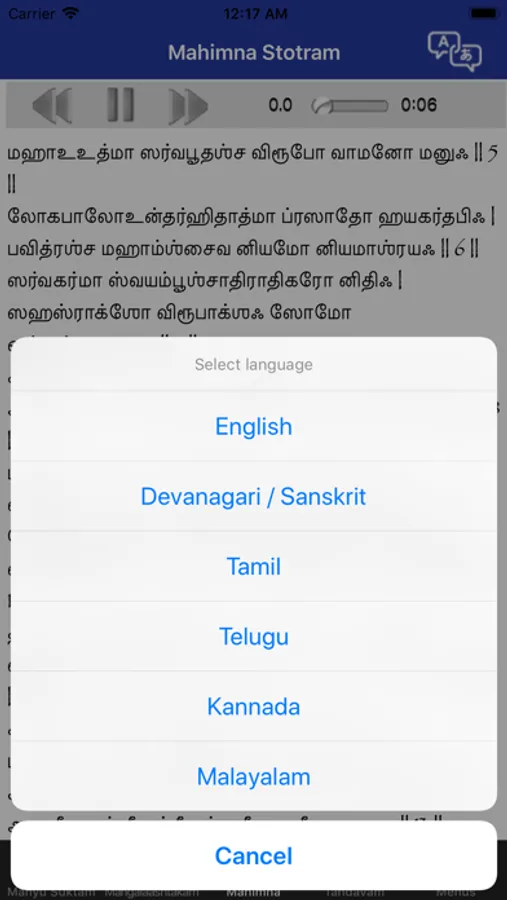 * Lyrics available in English,Thamil ,Sanskrit,Telugu,kannada & Malayalam (User can select different languages for lyrics using Language icon in the top Right corner) .