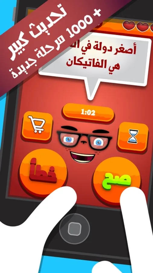 لعبة السؤال القوي - صح أم خطأ لعبة الأسئلة الممتعة بطريقة جديدة كلياً اختبر معلوماتك العامة ، سواء كانت علمية ، رياضية ، دينية، تاريخية ، جغرافية أو فنية .. هنالك العديد و العديد من المراحل في هذه اللعبة لجعلها أكثر متعة و إثارة .. حقائق مذهلة و معلومات جديدة بجميع المجالات .. اختبر سرعة بديهتك و معرفتك بأجمل و أحدث لعبة معلومات.