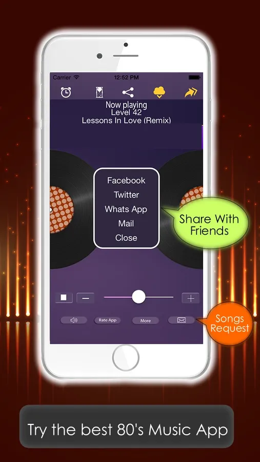 Unlimited 70s 80s 90s music, songs, top hits from all genres, sleep timer, alarm clock to wake up with your favourite music, Facebook, Twitter & more!