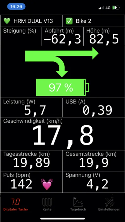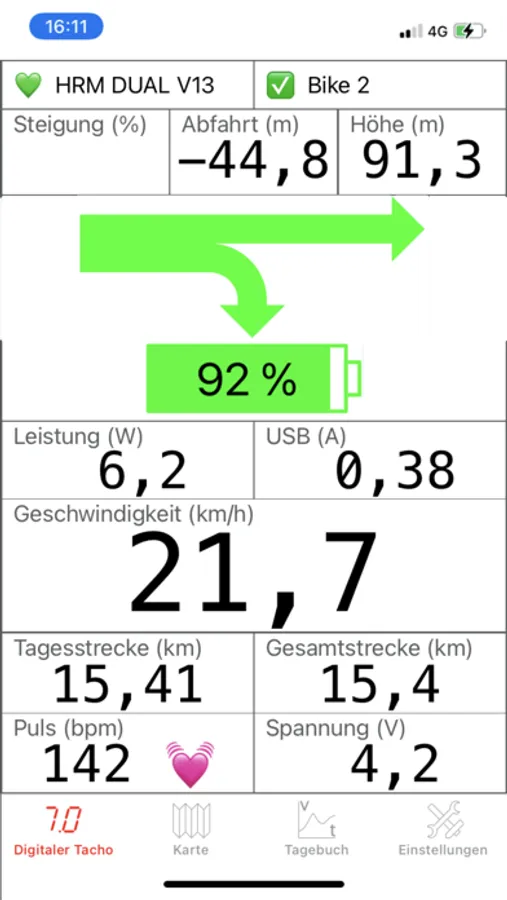 In addition, the charging status of the integrated power bank is also displayed in the app. You can also find the data of the charging power of the hub dynamo and the power delivered to your smartphone in the freely adjustable data fields of the app.