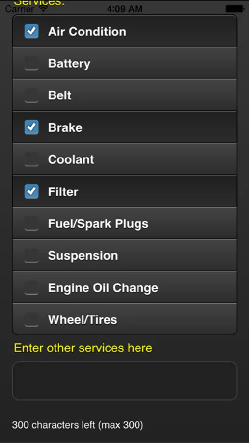 Air condition, battery, timing belt, brakes, coolant, filters, fuel/spark plugs, suspension, engine oil change, tires change