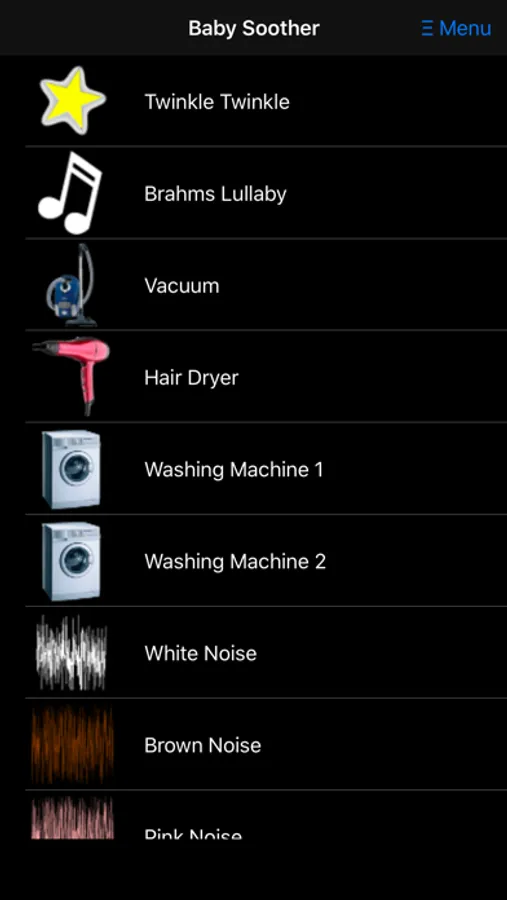 Choose from the different low frequency sounds, relaxing ambient noises or lullaby music. Repeat each sound for your chosen duration.