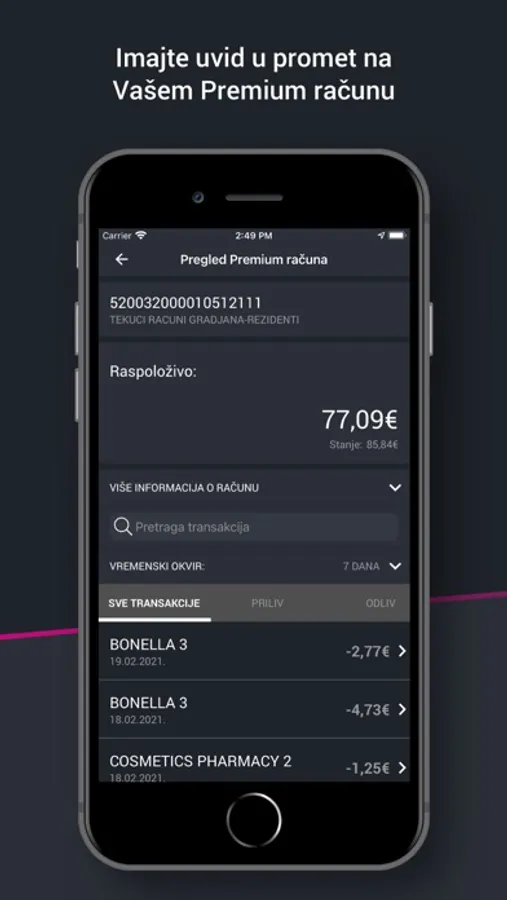 Kao korisnik aplikacije, u svakom trenutku, na svom mobilnom telefonu imate direktan pristup računu za koji je vezana Vaša Premium kartica. Gdje god se nalazili – 24 sata dnevno, 7 dana u nedjelji, Vaše finansije su na par klikova daleko. Najvažnije pogodnosti u okviru mobilnog bankarstva Premium program aplikacije: