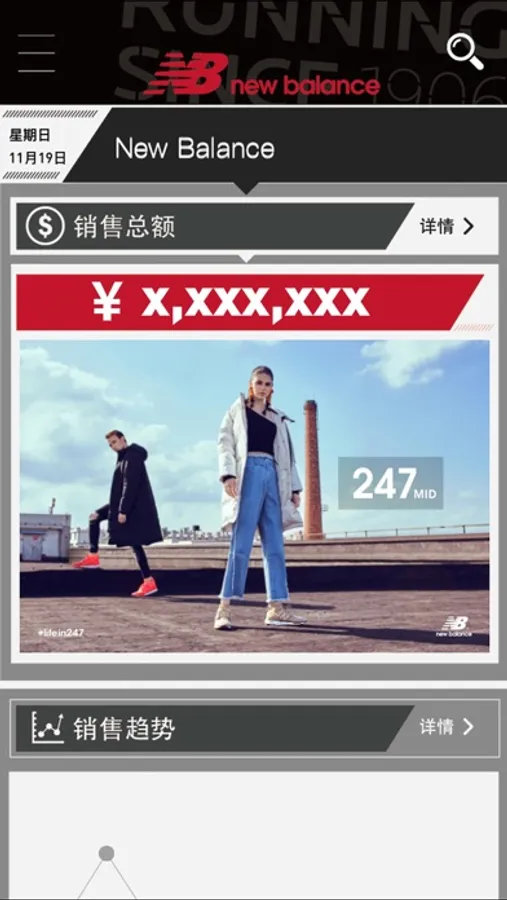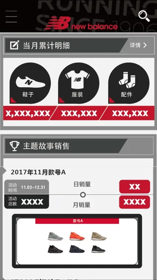 该APP工具适用于New Balance中国与其零售店铺的信息沟通,其将品牌的市场和产品信息通过该工具发布给每家店铺,同时也通过该工具手机店铺的图片和陈列,以及每天和每月的必要销售及库存数据,帮助品牌进行报表分析。