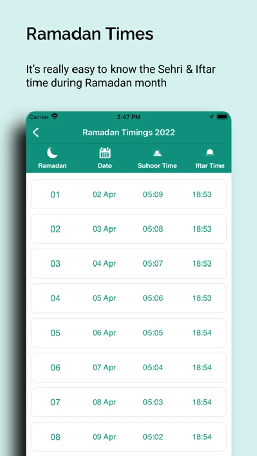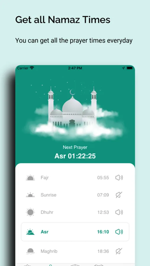 - Show the times for the Fajr, Sunrise, Dhuhr, Asr, Maghrib, and Isha prayers