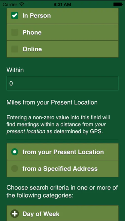 Your location is sent to our servers only when you, at your sole discretion, explicitly do a search for meetings within a specified radius from your present location.