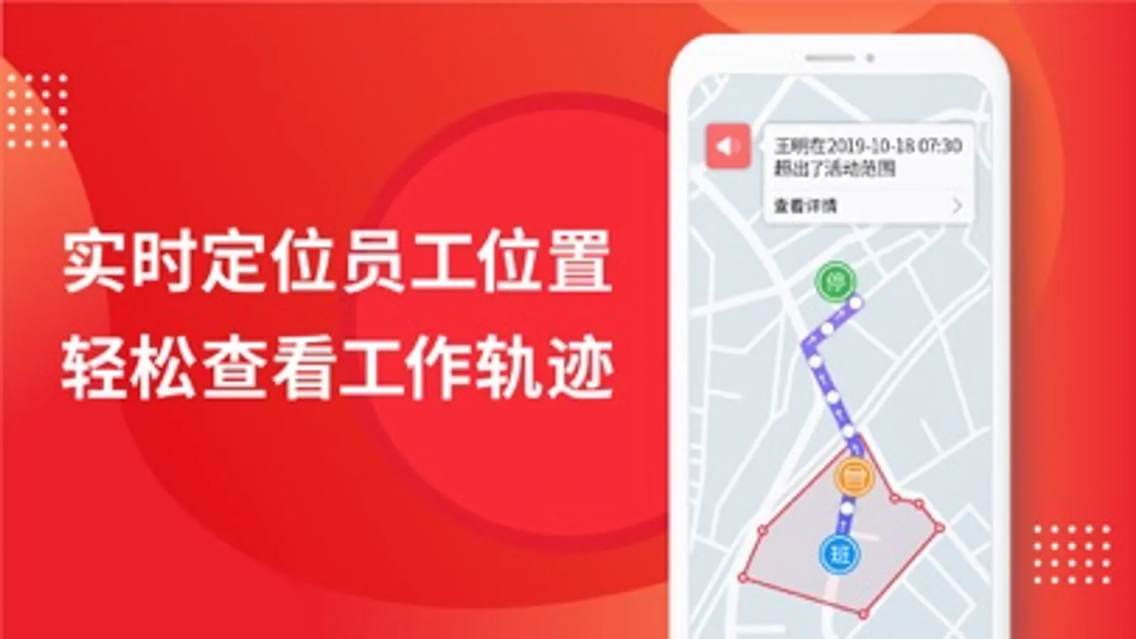 电子围栏:圈定工作区域,进出围栏,即发出报警,通知推送给上级领导,实时监督