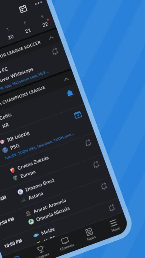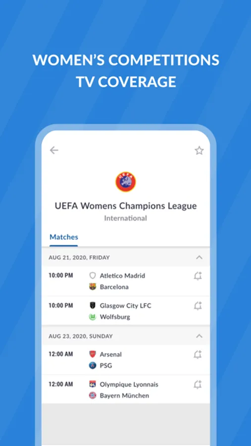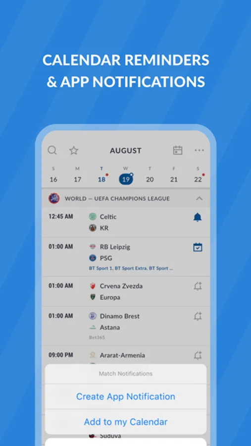 Use the app to add the live match times and broadcast listings of your favorite teams and matches to your calendar to get timely reminders. Or get vital kick-off reminders from 24 hours to up to 30 mins before the game, as well as visual and audible notifications of your favorite matches at the kick-off time.