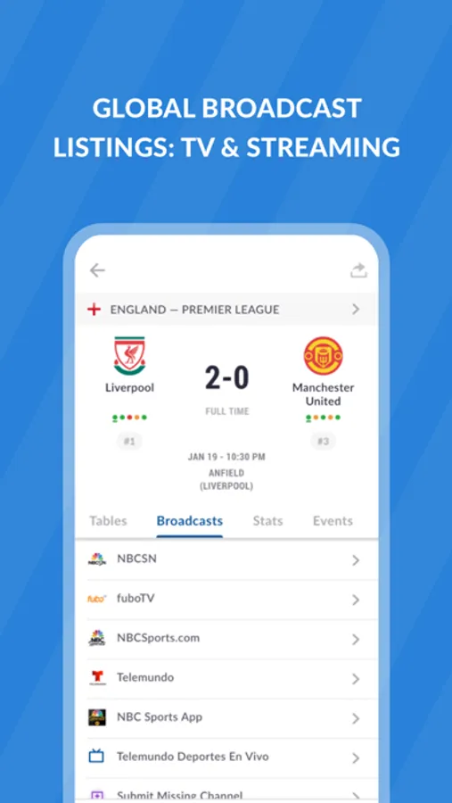 *Please note: The Live Soccer TV app does NOT provide any live streaming in the app or any linking or promotion of live or non-live matches by illegal or unofficial broadcasters, unlawful streaming, or match downloads. All links from the Live Soccer TV app are directed only to the official rights holders, the TV networks, and broadcasters. We also provide listings and links to 3rd party broadcasters that have acquired the broadcasting rights through sub-licensing deals as per the availability of such broadcasts.