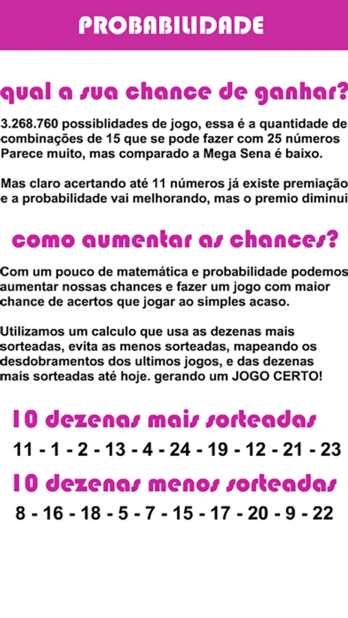 Não existe fórmula mágica paga ganhar na Lotofácil, mas desenvolvemos um cálculo baseado nas 10 dezenas mais sorteadas de todos os tempos e nos ultimos 6 jogos sorteados que pode aumentar sua chance em até 25%!