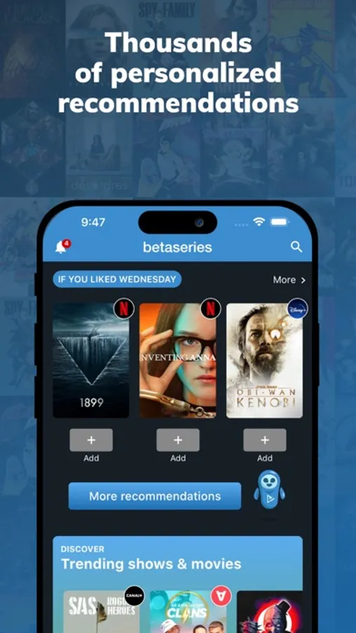 BetaSeries is a movies and shows community. Find it on BetaSeries.com, alongside with your fully synchronized account. We are available on social networks if you wish to contact us and share your ideas.