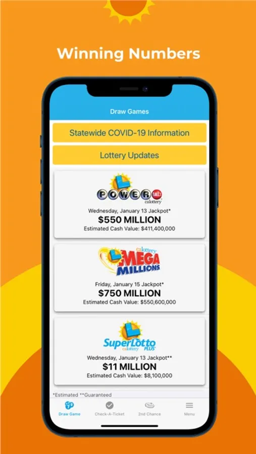 Welcome to the California Lottery Official App, where you can follow the Lottery in the palm of your hand - anytime, anywhere. Download the app today to personalize your experience by choosing your favorite ways to play!