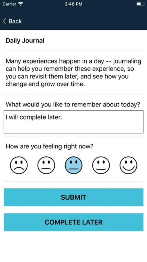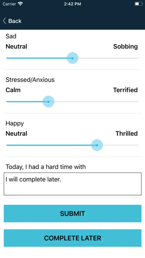 The software interacts with the end user through a simple application that easily and quickly records quick surveys on a daily (or more frequent) basis. For example, a therapist can use it to ask simple mood mapping questions (e.g., how anxious are you feeling right now?). The data is seamlessly synced with the administrator providing the questions who can then view, analyze and download the data from a centrally managed web-interface.