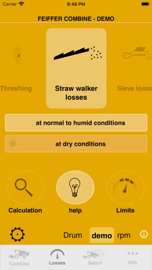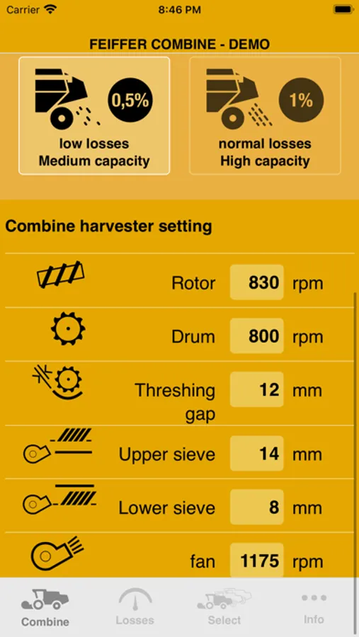 Calibration of combine harvesters made easy - The "feiffer combine" App is an easy step by step guide to the optimum settings of your combine harvester. It can be done quickly and safely because these setting values are field-tested and have proved to be reliable with expert operators. The distinguishing feature of this App is: It adapts the settings also to throughput and losses. In this way, the combine harvester is always set properly not only at all harvest conditions but also within each performance range. Losses are limited.