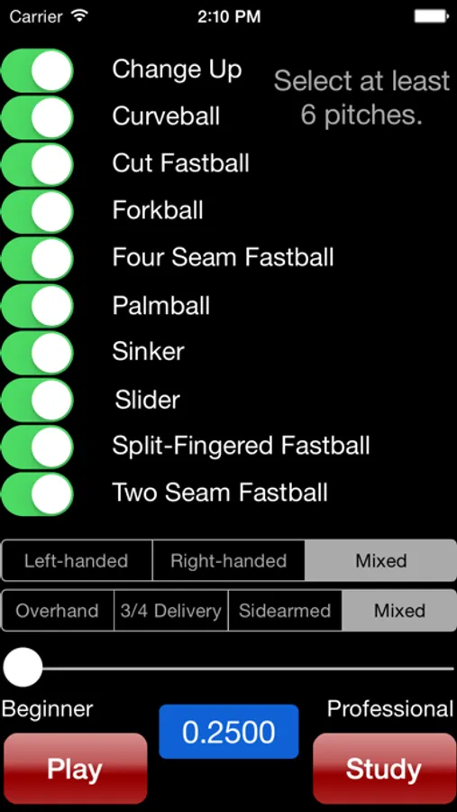 For hitters who are just starting out you can fully customize the number and type of pitches and the handedness and arm slot of the pitcher or for advanced hitters you can allow any pitch, both right and left handers and every arm slot. The speed at which the pitch is displayed is also independently customizable.