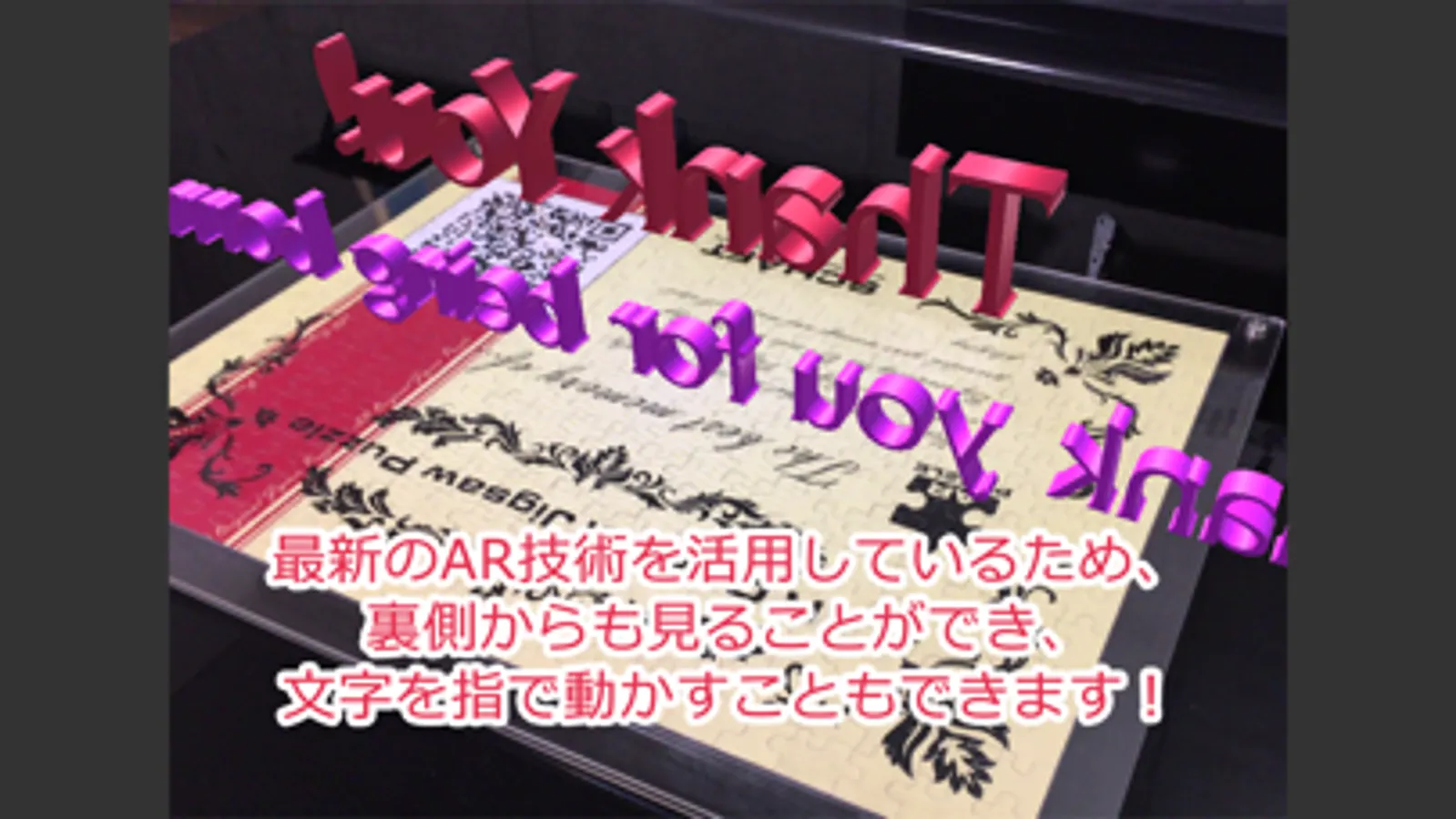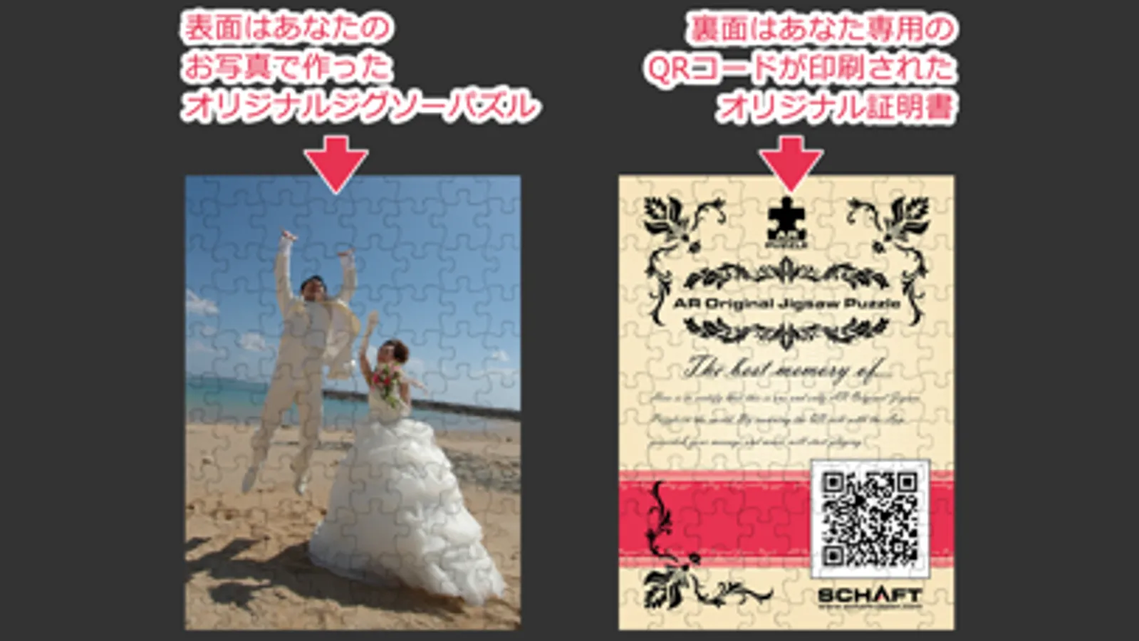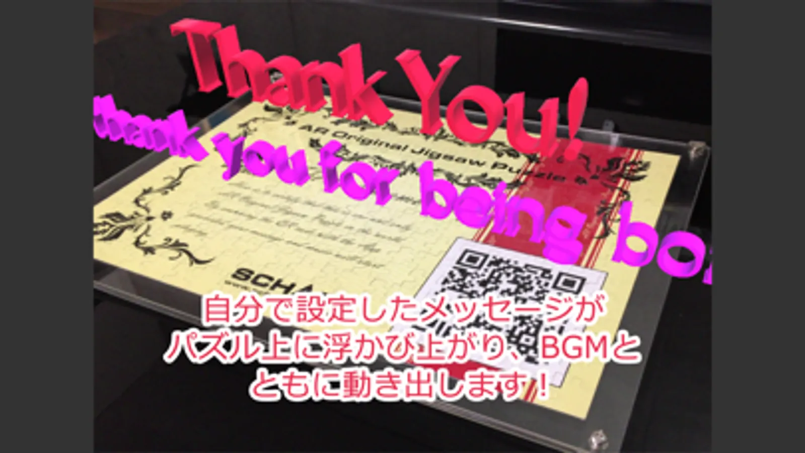 まずは、あなたの好きなお写真をメールで送っていただき、世界に一つだけのジグソーパズルを製作致します。そのオリジナルジグソーパズルの裏面は、あなた専用のQRコードが印刷された証明書になっています。このQRコードを本アプリで読み取りと、パズル(証明書部分)から文字が浮かび上がってきて、あなただけのメッセージが、BGMとともに再生されます!