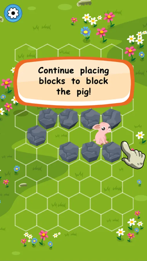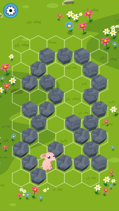 Place hex blocks in the way of the fugitive pig in "Block the Pig," a turn-based puzzle game! The game rules are simple. Tap on an empty cell of the hexagon board to place a block. Before the round starts, close the shortest escape routes on the board with 3 bonus blocks. The pig will then run away from the hex maze. Place a new block after each move the pig makes, until there's no way out! As rounds advance, the hexagon maze becomes sparser and the pig blocking quest trickier.