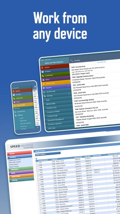 You can sign your invoices, as well as let your customers sign on your phone or tablet to accept an invoice, quote or estimate. You can email, print or share any bill or estimate with other apps such as Facebook, WhatsApp or SMS. You have an invoice template with a professional design that can be sent as a PDF or JPG. SpeedInvoice makes your business look good and is simple to work with. You can profile your business with your logo and a flexible document design to create great looking business invoices. SpeedInvoice is a quick and professional invoice and quote maker.