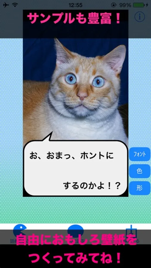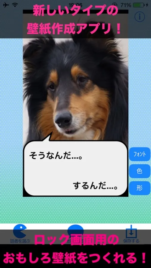 吹き出しテンプレートを使って、自由におもしろ壁紙がつくれるよ。