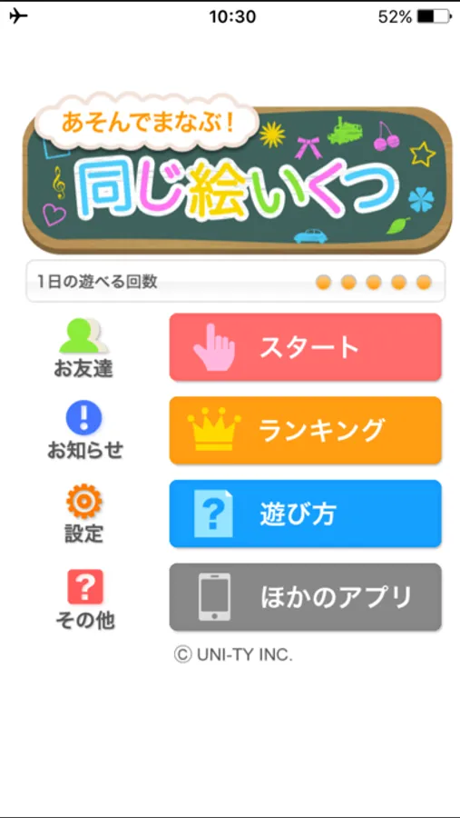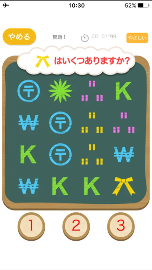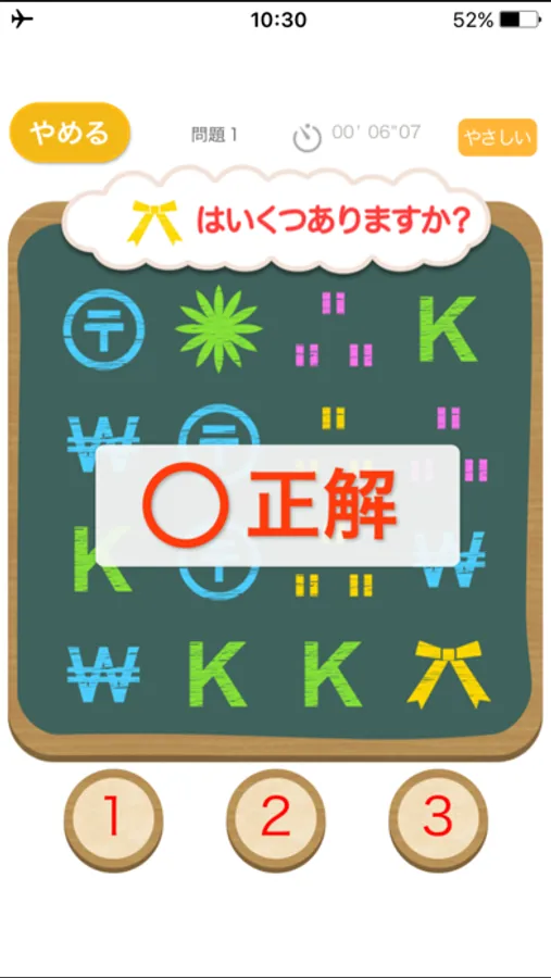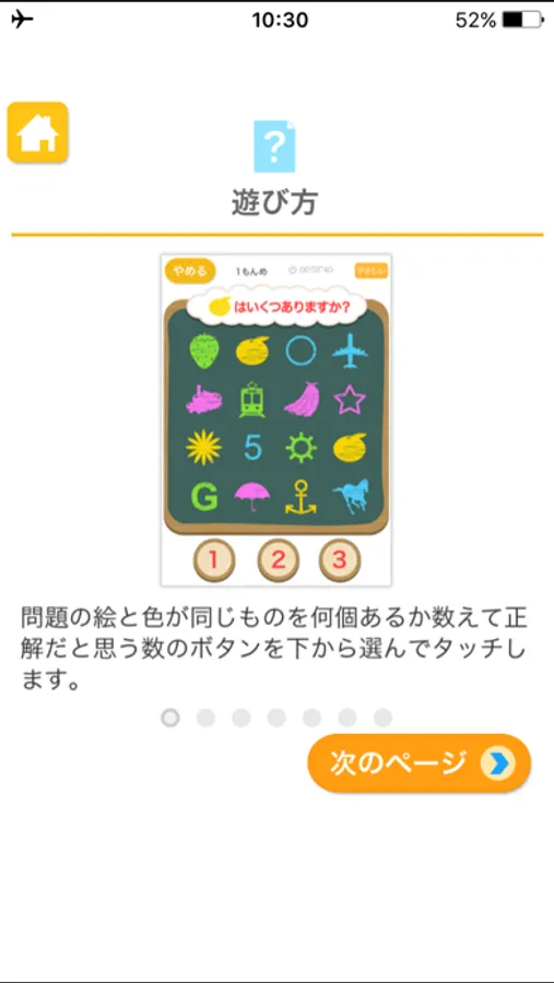問題の絵と色が同じものを何個あるか数えて当てるアプリです。